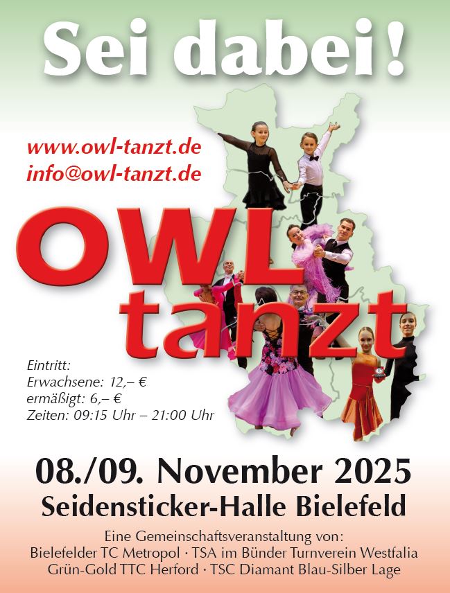 Am Samstag, 08.11.2025, öffnen sich ab 8.00 Uhr die Türen der Seidensticker Halle in Bielefeld. 2 Tage werden wieder im Zeichen des Tanzsports stehen!